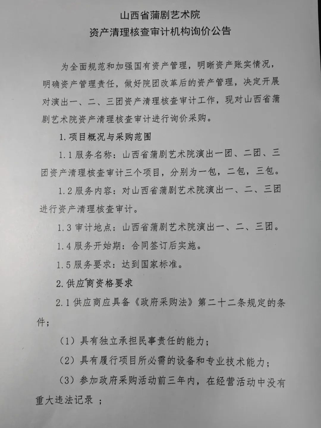 山西省蒲剧艺术院资产清理核查审计机构询价公告