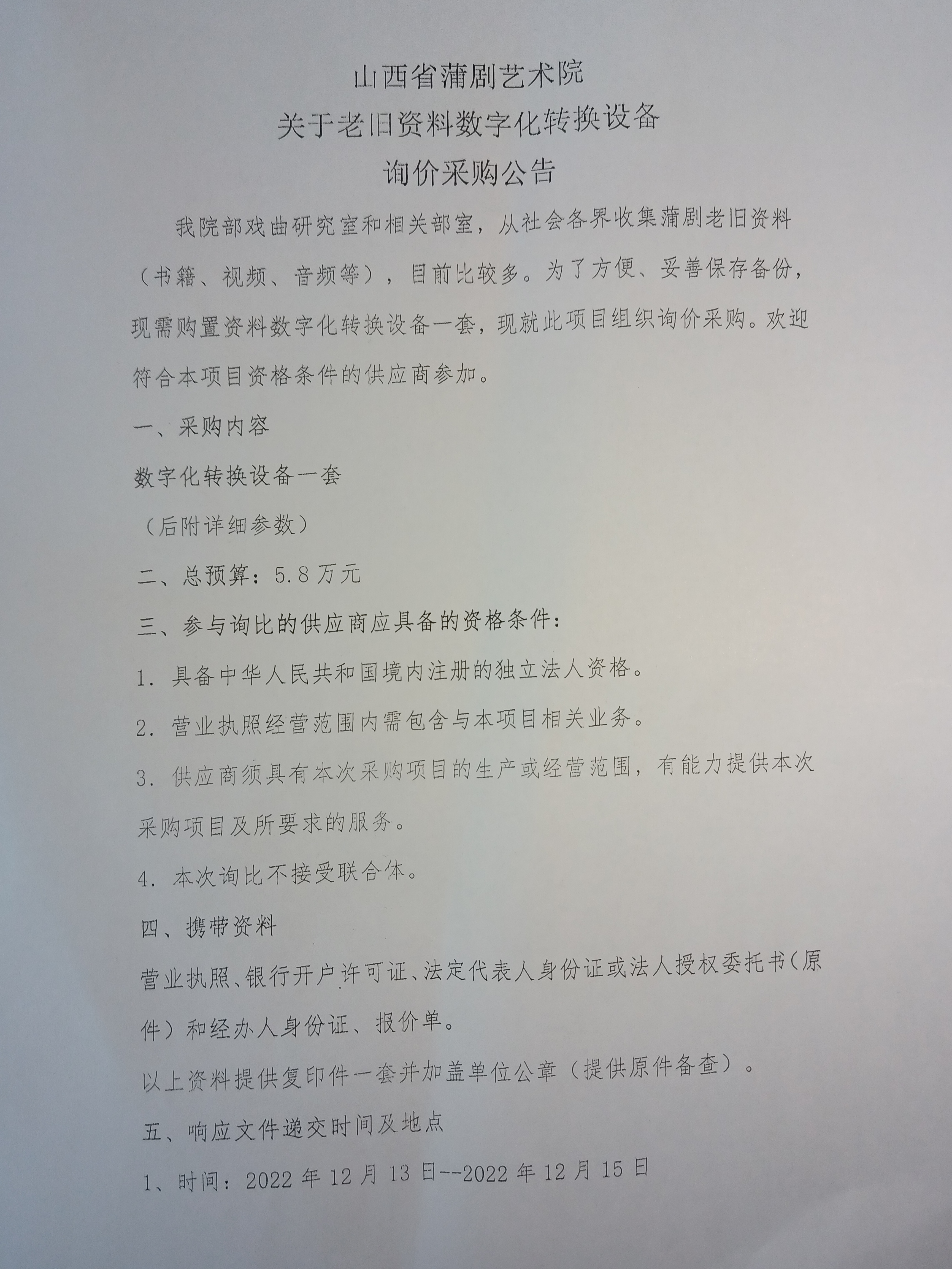 山西省蒲剧艺术院关于老旧资料数字化转换设备询价采购公告