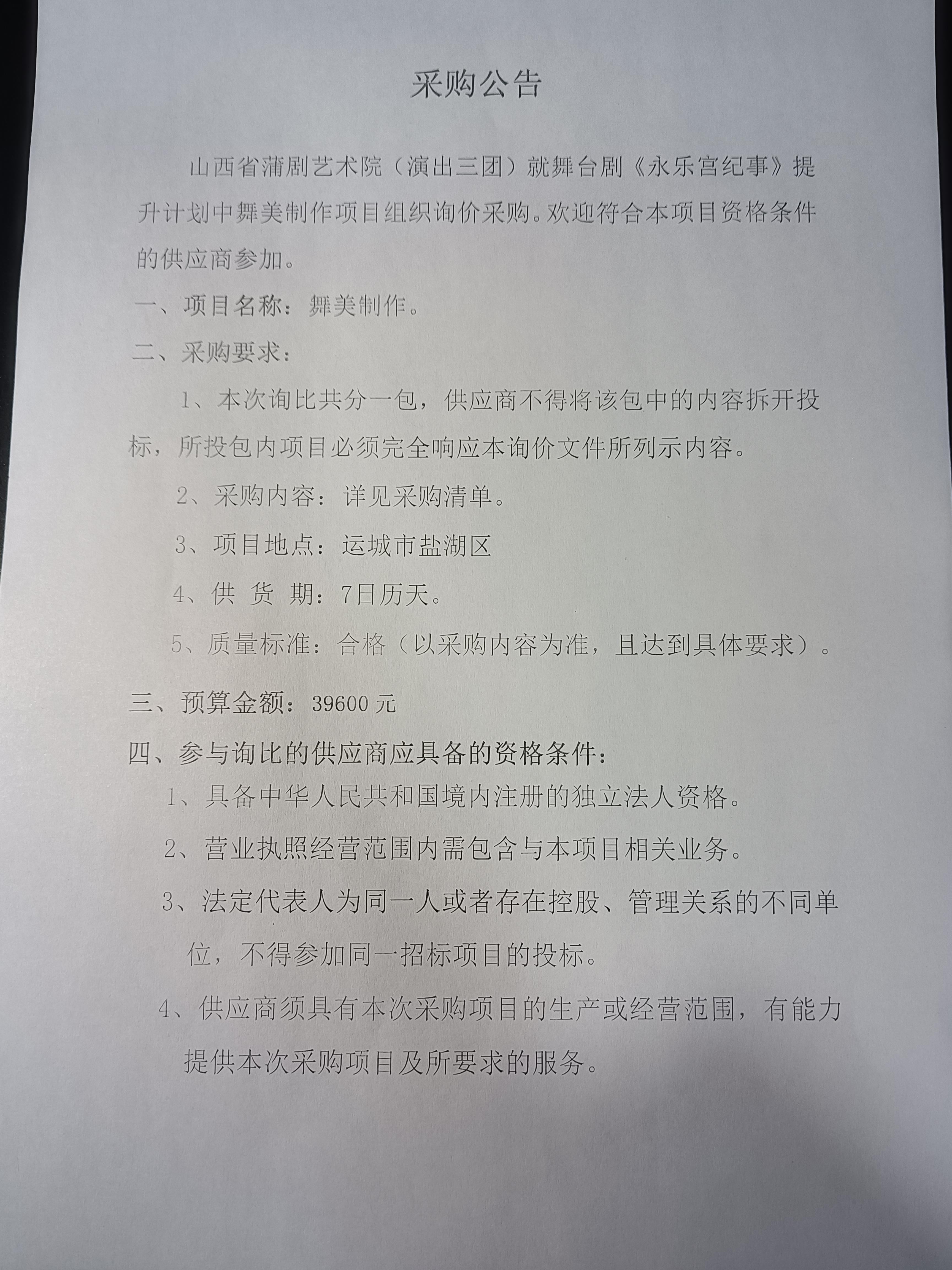 山西省蒲剧艺术院演出三团就舞美制作项目组织询价采购