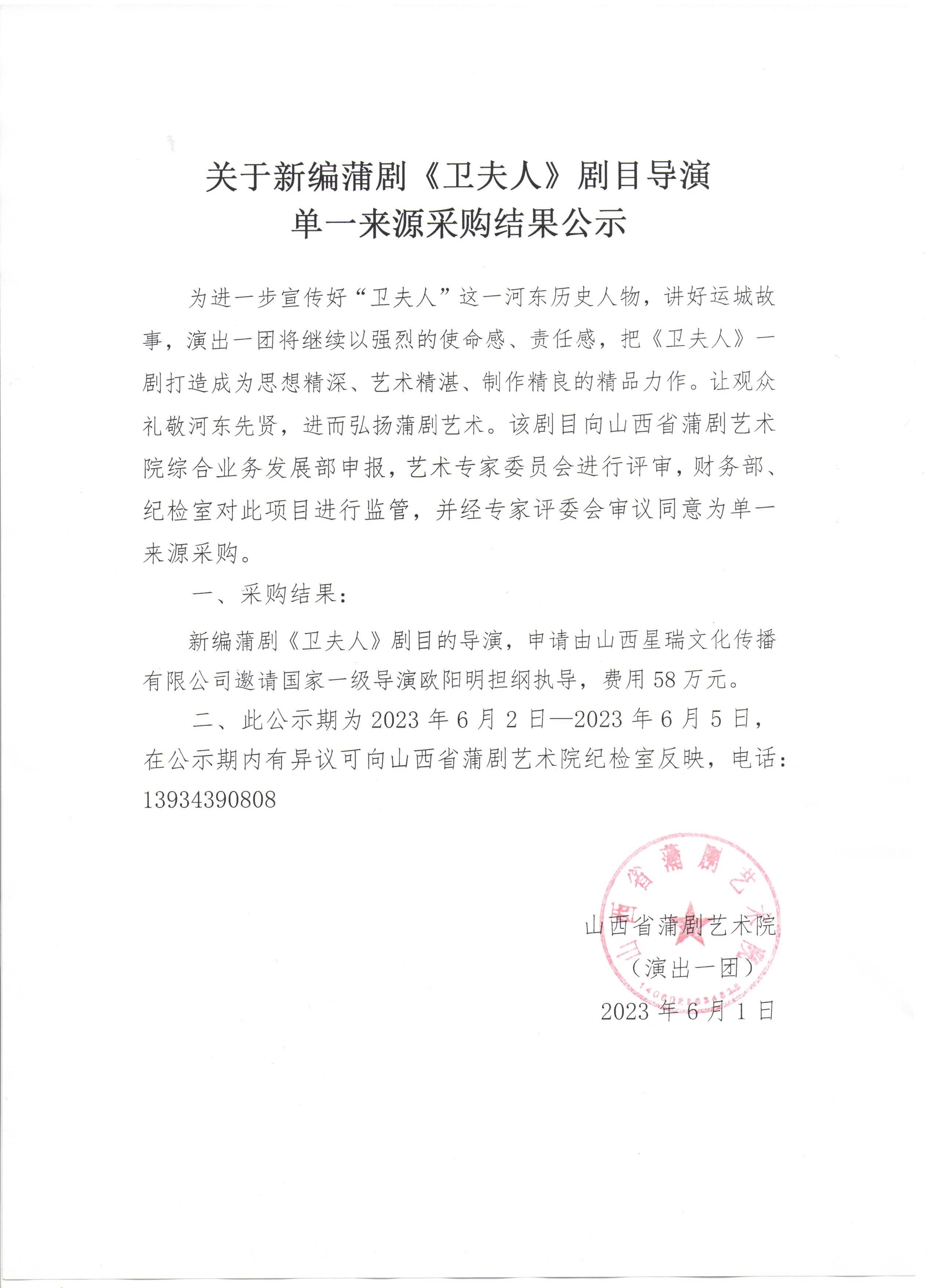 关于新编蒲剧《卫夫人》剧目导演单一来源采购结果公示