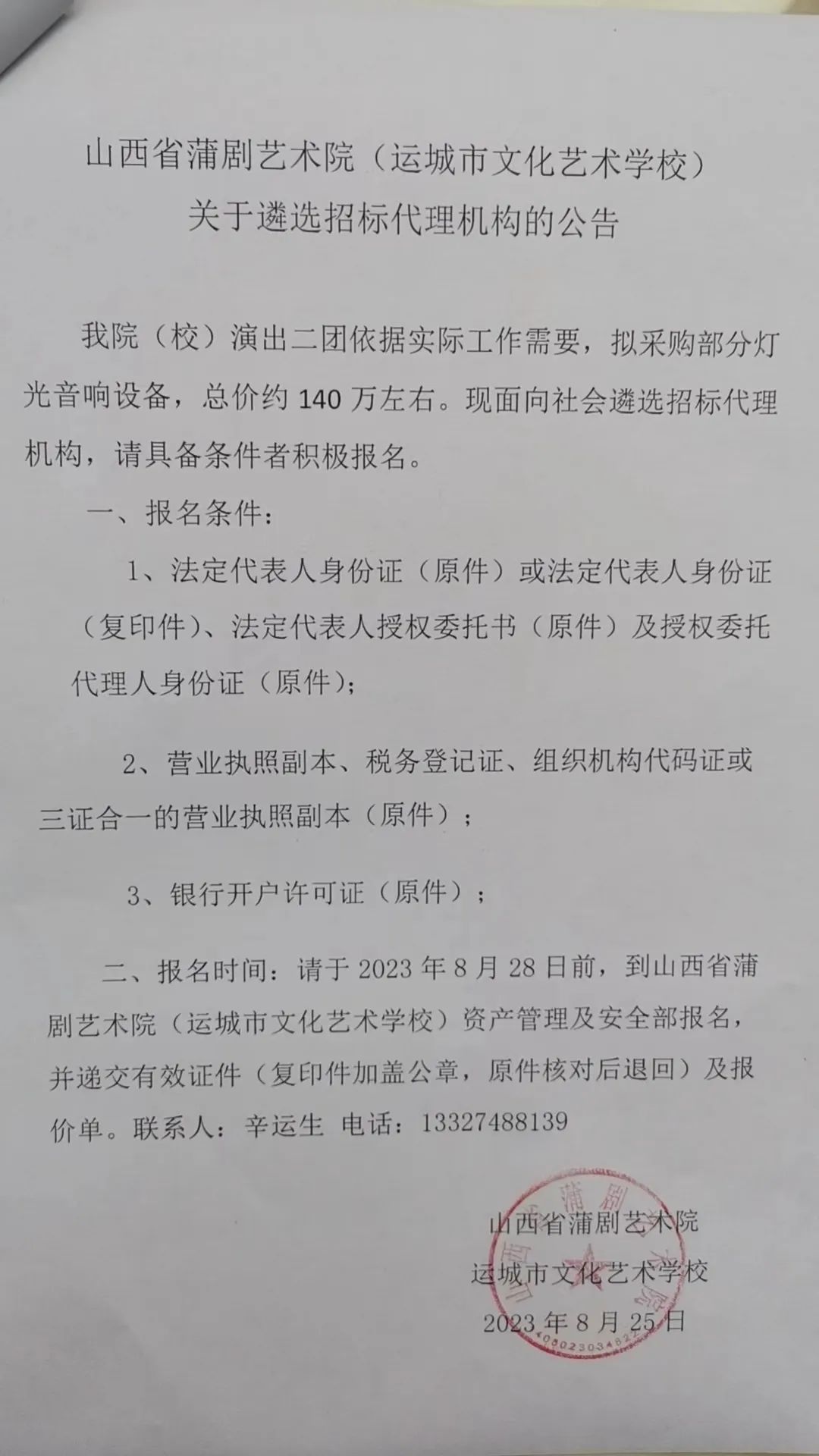 山西省蒲剧艺术院(运城市文化艺术学校)关于遴选招标代理机构的公告