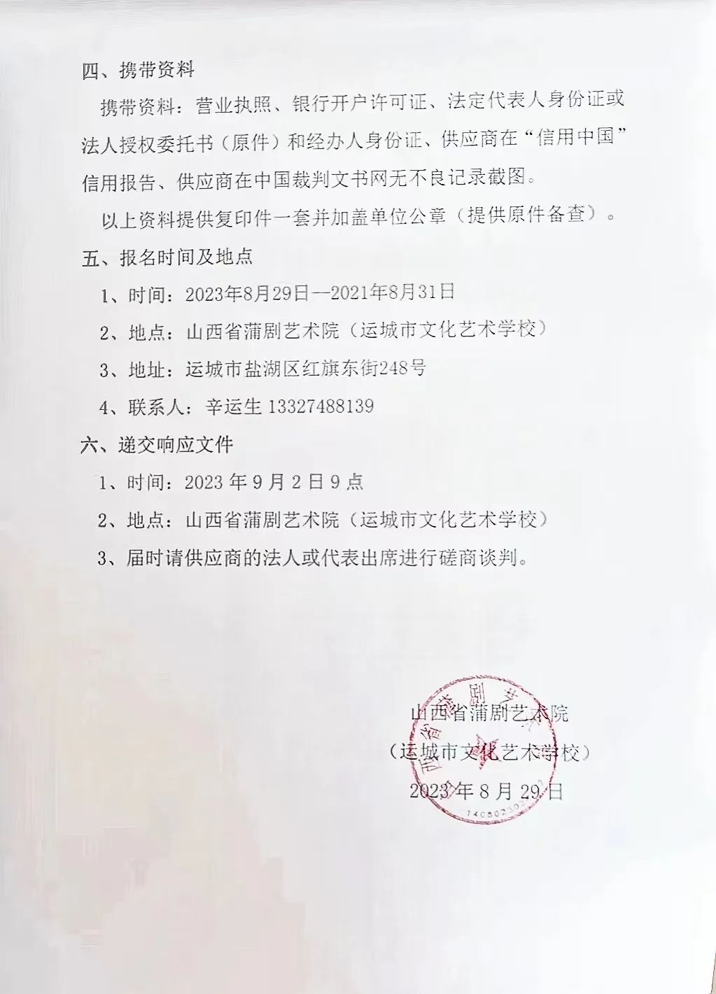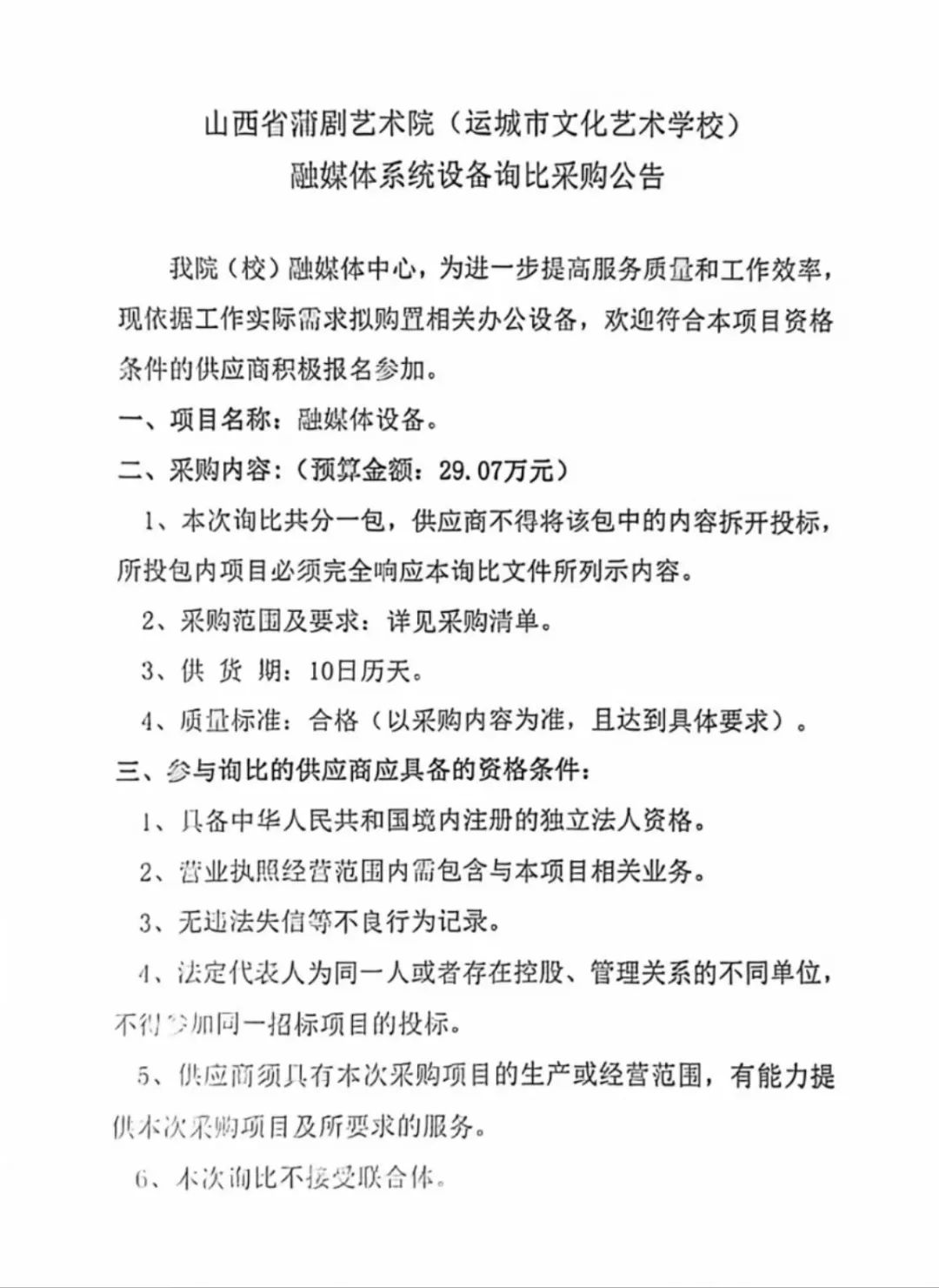 山西省蒲剧艺术院(运城市文化艺术学校)融媒体系统设备询比采购公告