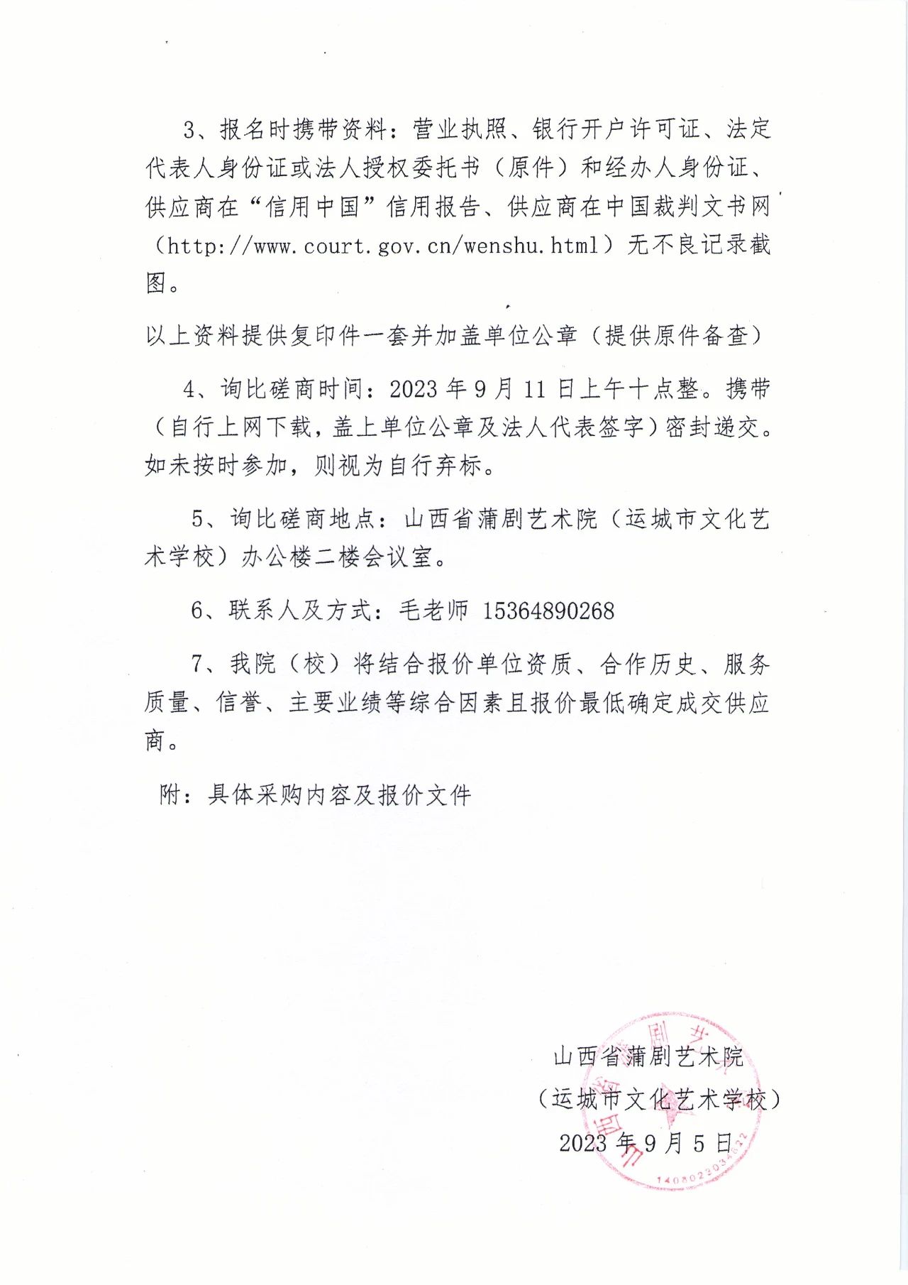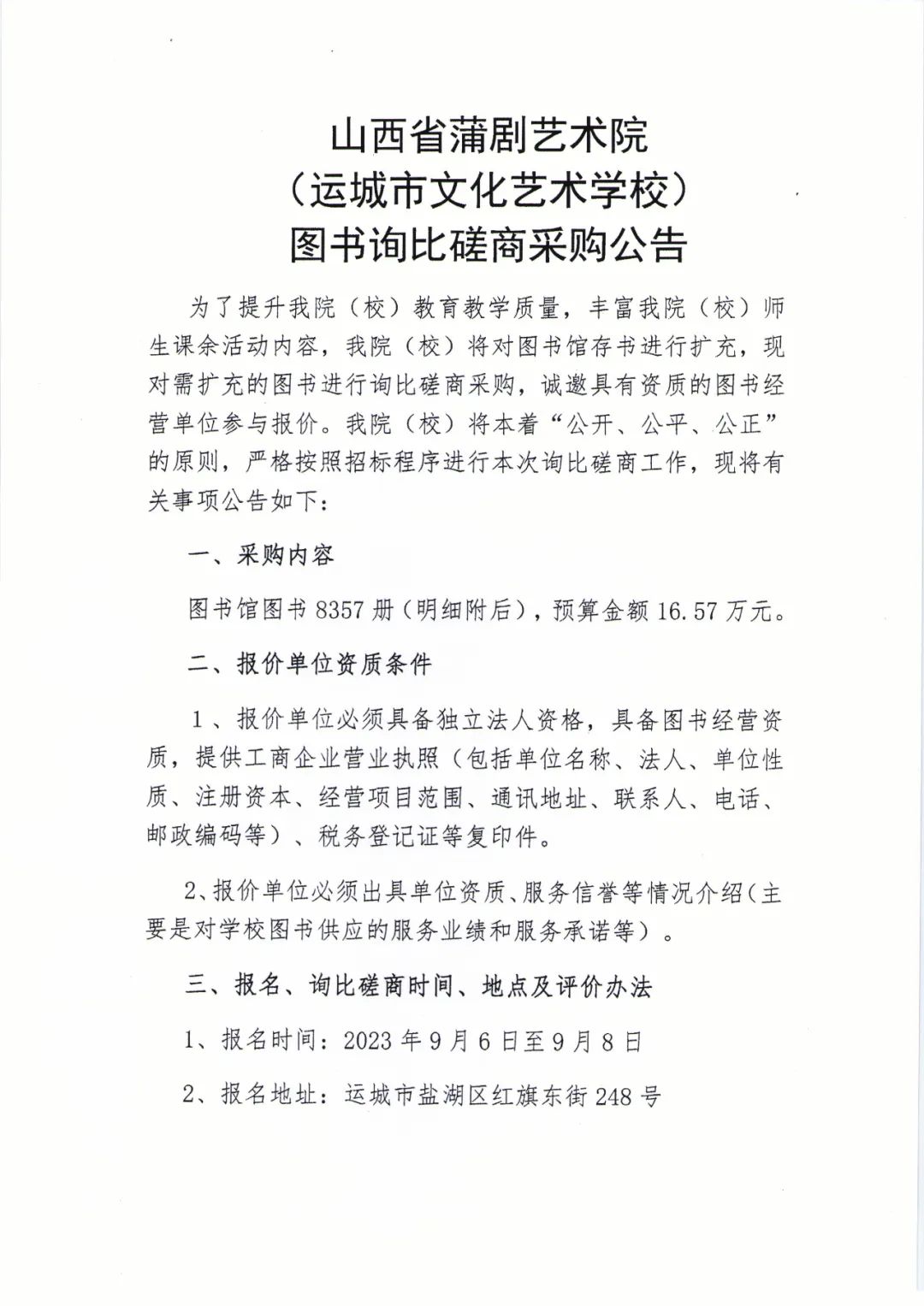 山西省蒲剧艺术院(运城市文化艺术学校)图书询比磋商采购公告
