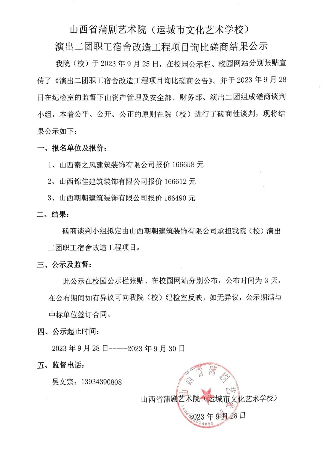 山西省蒲剧艺术院(运城市文化艺术学校)演出二团职工宿舍改造工程项目询比磋商结果公示