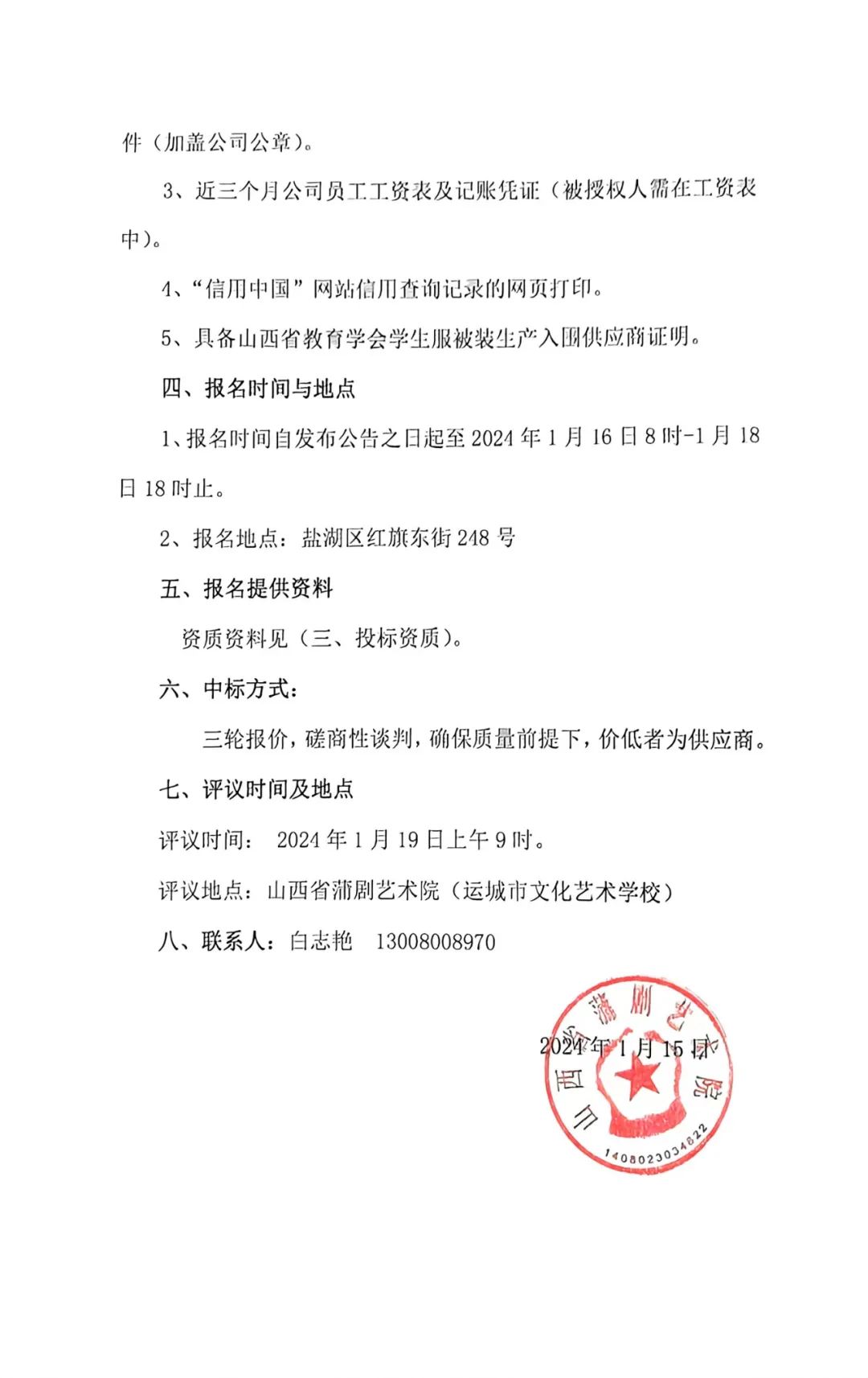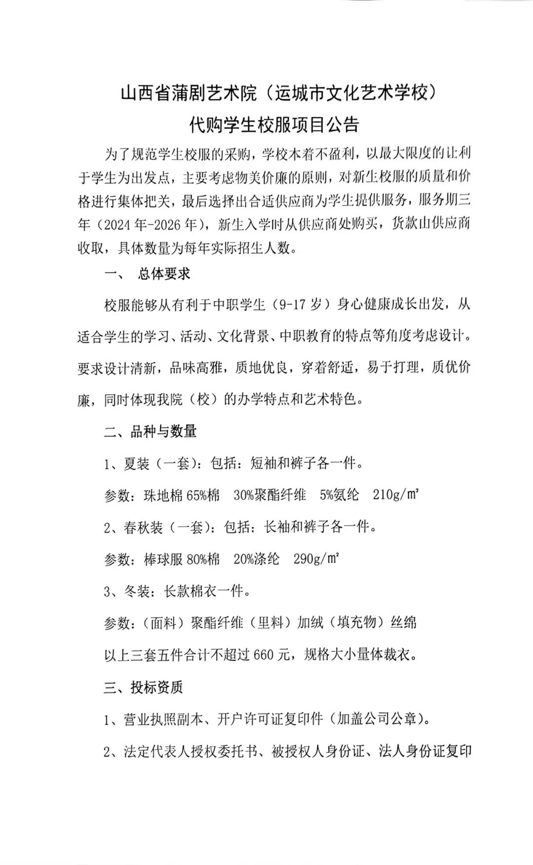 山西省蒲剧艺术院(运城市文化艺术学校)代购学生校服项目公告