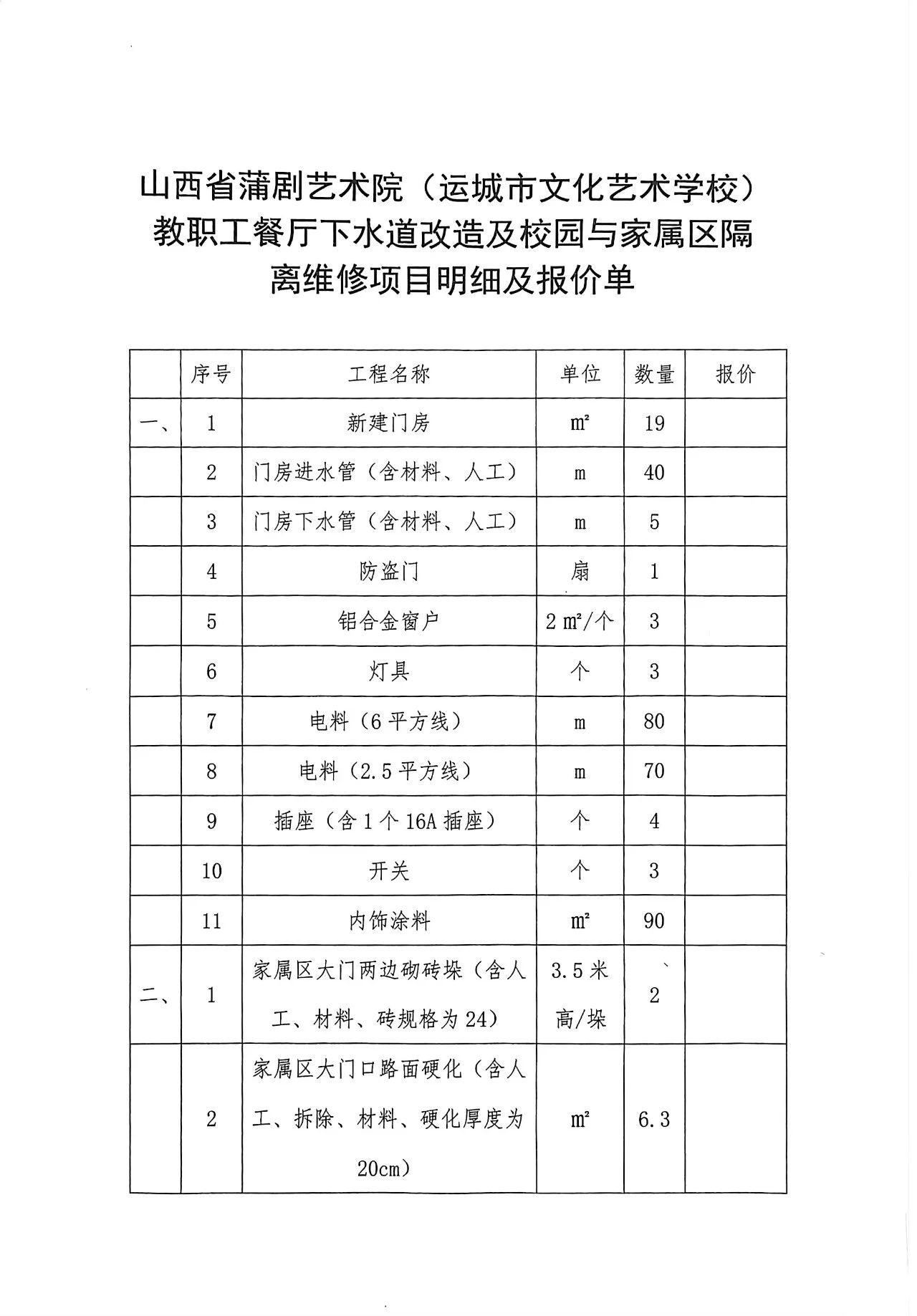 山西省蒲剧艺术院(运城市文化艺术学校)教职工餐厅下水道改造及校园与家属区隔离维修项目询价公告
