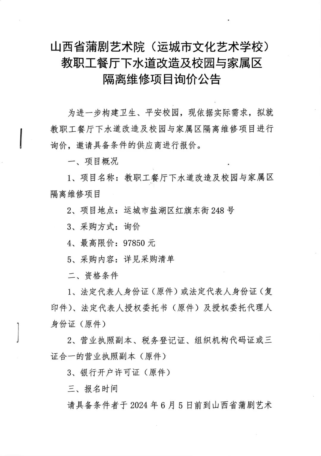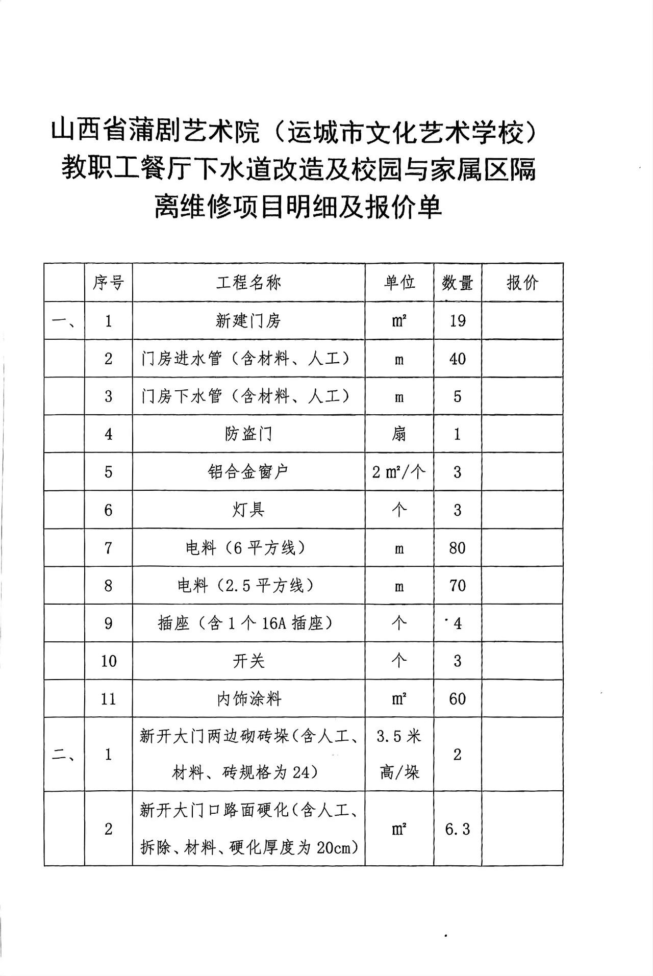 山西省蒲剧艺术院(运城市文化艺术学校)教职工餐厅下水道改造及校园与家属区隔离维修项目询价公告
