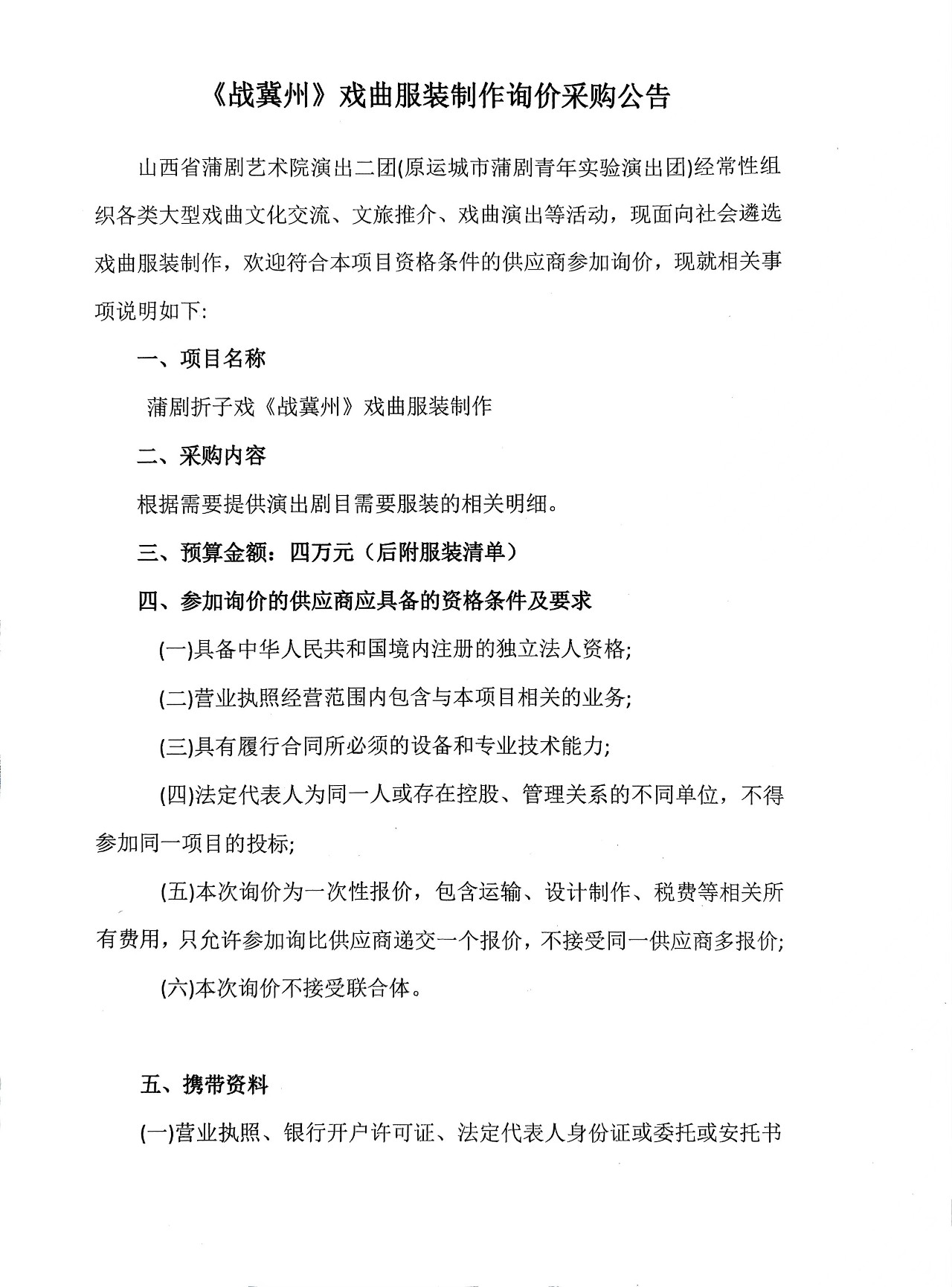 山西省蒲剧艺术院(运城市文化艺术学校)《战冀州》戏曲服装制作询价采购公告