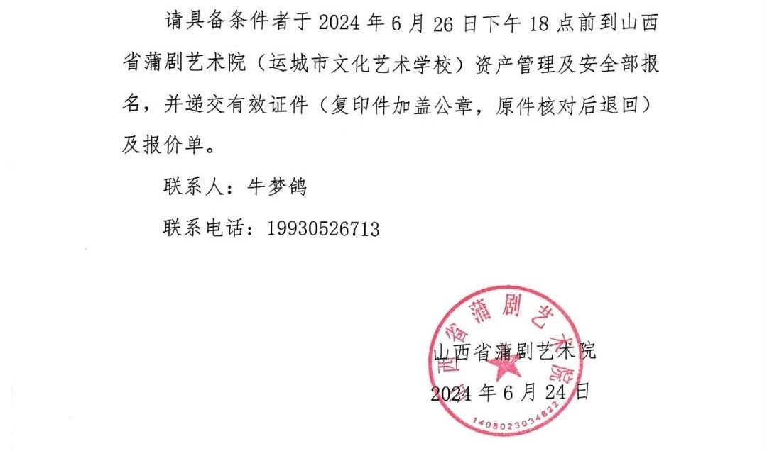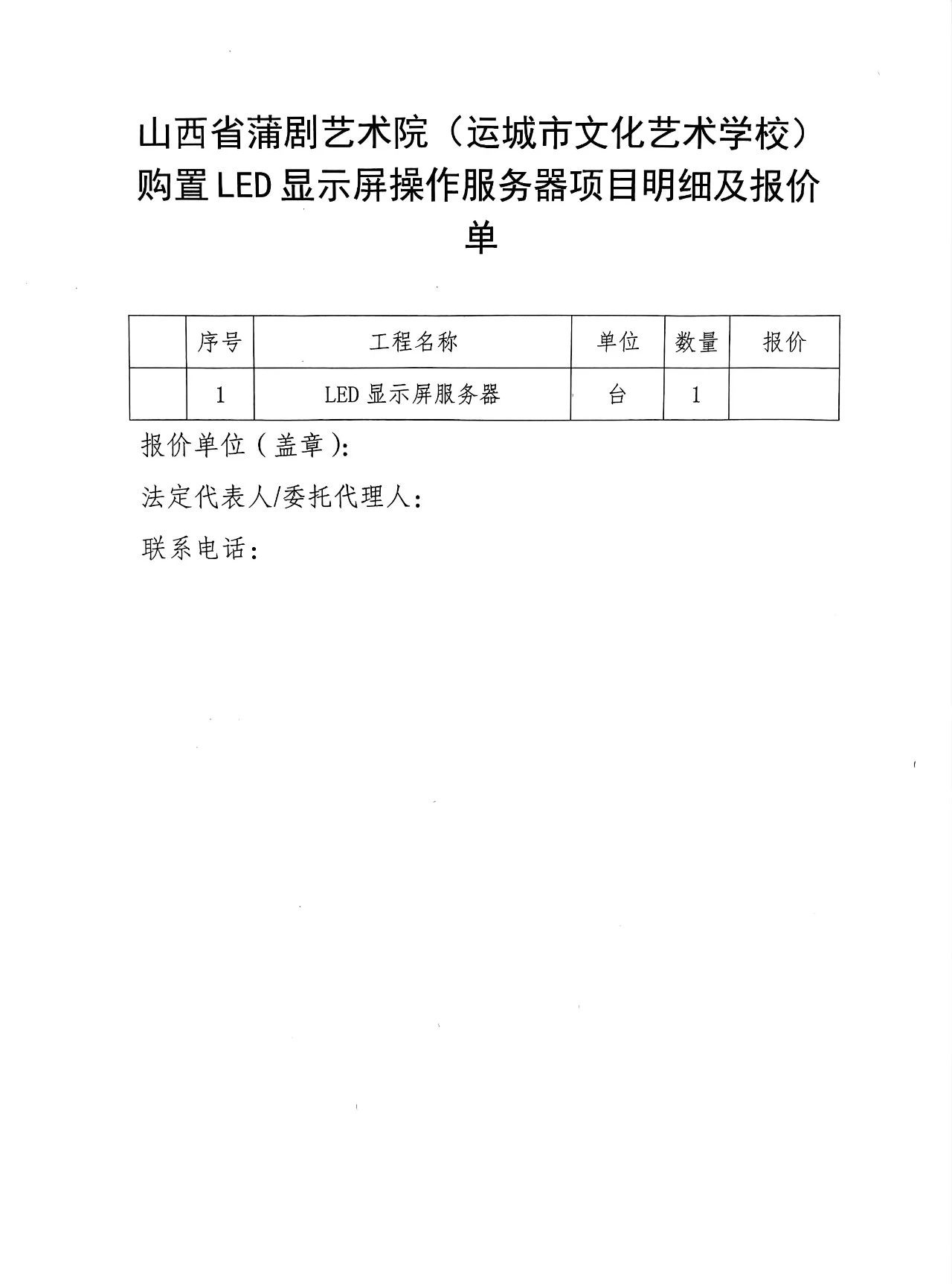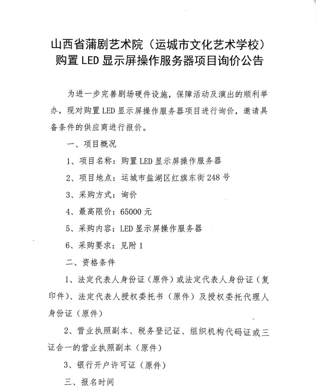山西省蒲剧艺术院(运城市文化艺术学校)购置LED 显示屏操作服务器项目询价公告