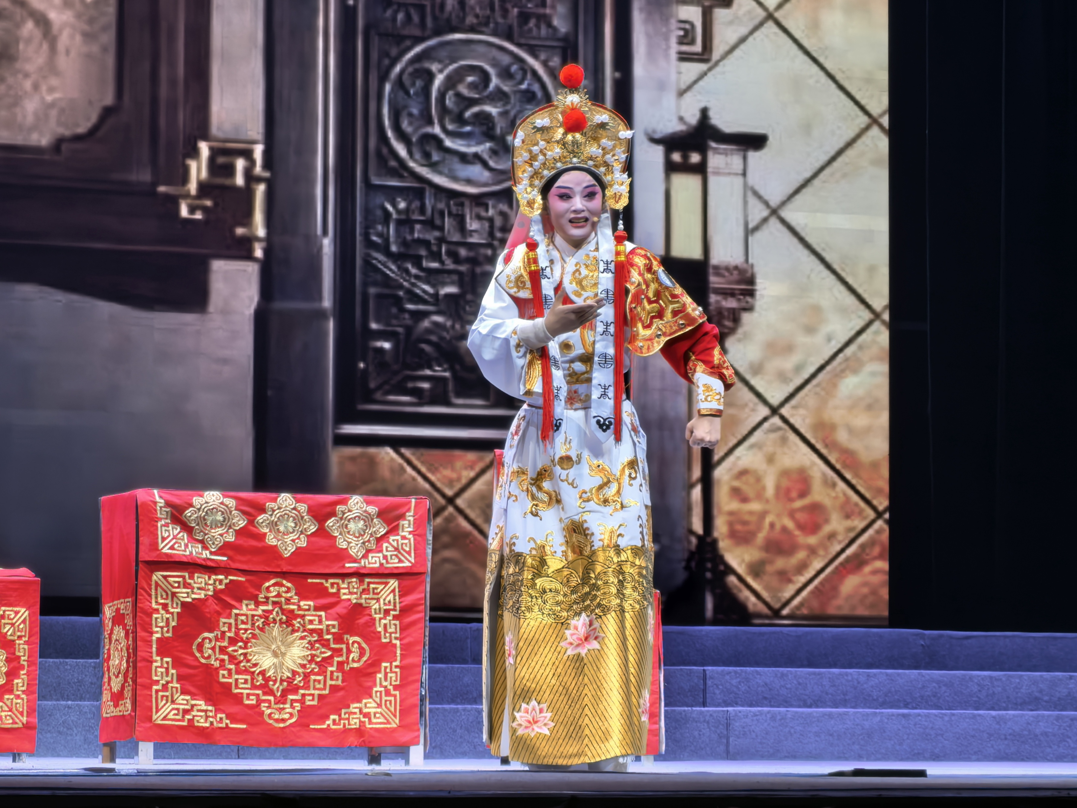 稍做休整后,郭倩倩换戎装再度登场,化身花木兰,舞台画风陡然切换。《花木兰》(思乡一折)中,她以舒缓的慢板唱腔演绎“举家人听说心花放”等经典唱段,将人物深沉的思乡情愫传递得真切动人。表演时,她时而微闭双眼憧憬归家场景,时而眼神坚定流露巾帼豪情,将女扮男装、替父从军十二载的巾帼英雄兼具刚毅与柔情的双重特质,层次分明地呈现在观众面前。
