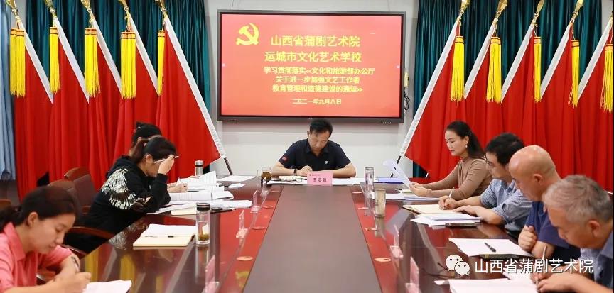 为进一步加强文艺工作者教育管理和道德建设,树立文艺新风,推动文艺生态健康发展,9月8日,山西省蒲剧艺术院(市文化艺术学校)召开会议,深入学习贯彻落实《文化和旅游部办公厅关于进一步加强文艺工作者教育管理和道德建设的通知》,并就贯彻落实工作进行研讨发言。山西省蒲剧艺术院(市文化艺术学校)党委书记王志凯,副书记、副院(校)长(主持工作)贾菊兰,纪检书记李改,副院长范剑青,副院长张晓燕结合自身工作实际,就如何加强文艺工作者教育管理和道德建设畅谈体会、建言献策。