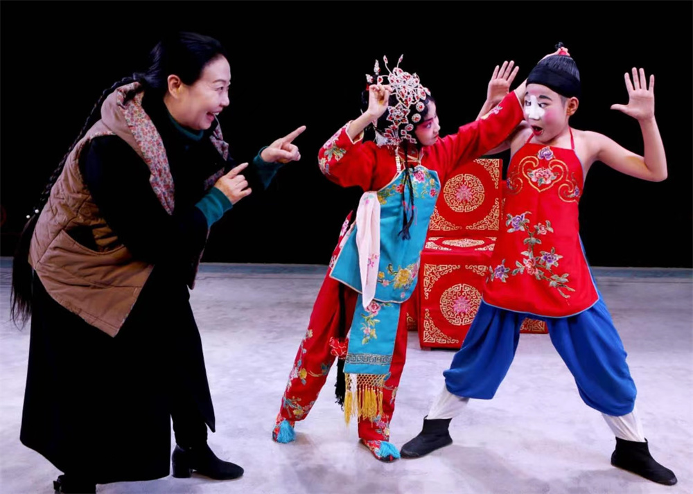 景雪变指导小演员表演《柜中缘》(资料图片)