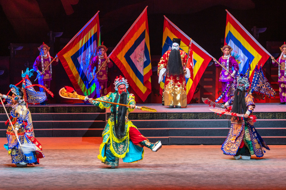 “东汉末年,天下大乱,战火纷飞,民不聊生,关羽诞生在中条山下盐池岸边的河东解梁……”伴随着雄浑有力的旁白声,手持青龙偃月刀、威风凛凛的关公出现在观众面前。山西省蒲剧艺术院的演员们功底扎实、唱腔惊艳,瞬间带领现场的观众回到了金戈铁马、英雄辈出的三国时代。