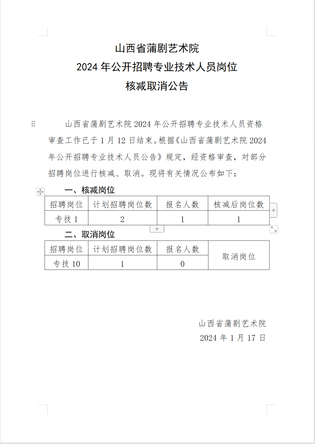 山西省蒲剧艺术院2024年公开招聘专业技术人员岗位核减取消公告