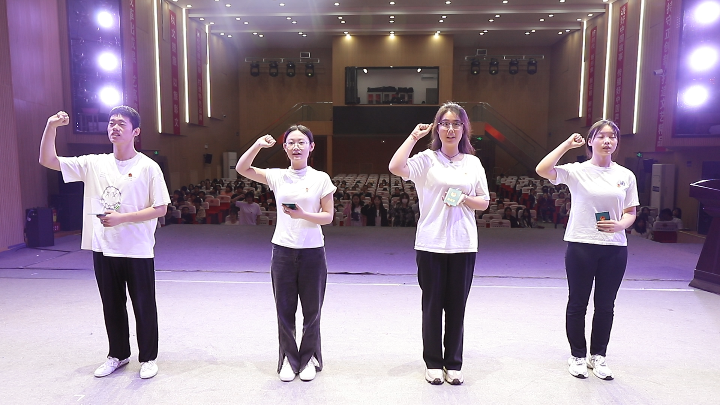 早上十点,大会在雄壮的国歌声中拉开帷幕。会上首先为新团员举办入团仪式,并邀请新团员学生代表李婧维发言,“作为一名新兴的共青团员,我们一定认真接受政治训练、加强政治锻造,努力成为有理想、敢担当、能吃苦、肯奋斗的共青团员,不断提高自我、完善自我、超越自我,为祖国的发展贡献青年人的力量”。随后与会领导为受表彰优秀学生颁发荣誉奖牌、证书,分别表彰2023-2024年度优秀班干部、2023-2024年度“三好学生”、2023-2024年度优秀共青团员、2023-2024年度优秀学生会干部等28位优秀学生代表。