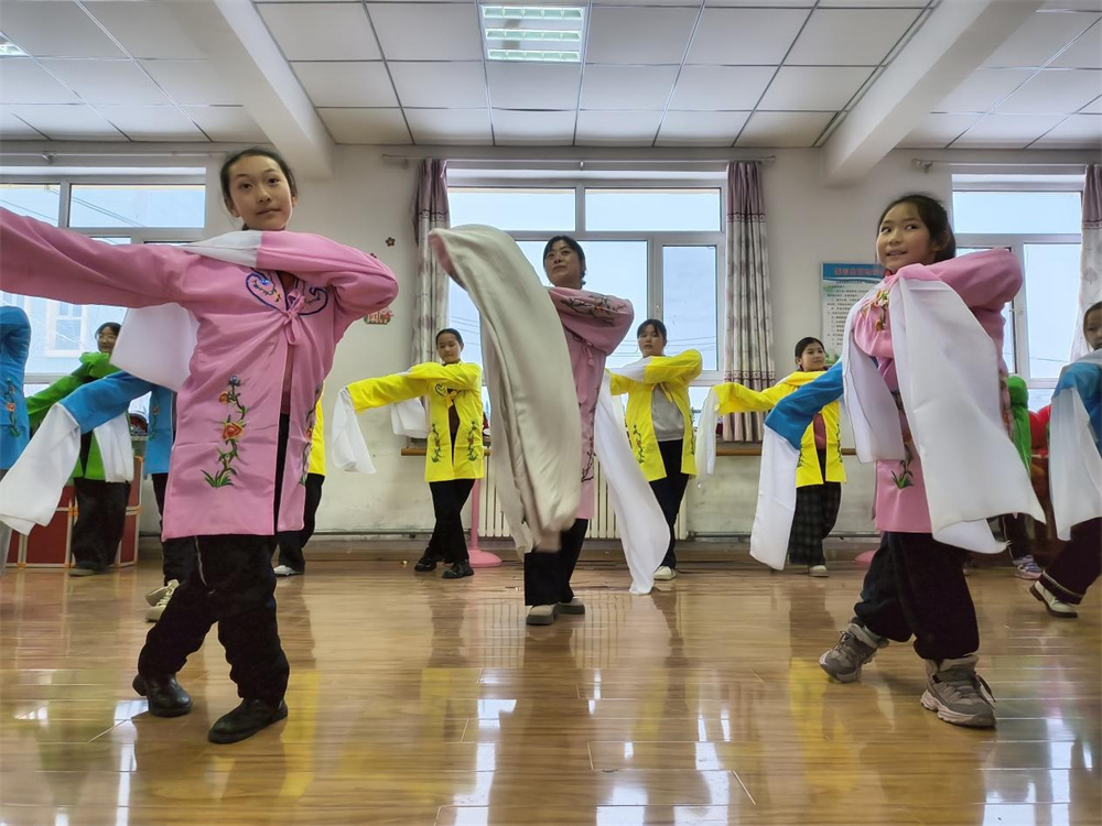 12月24日,张明霞(中)在土墩子农场学校教学生练习水袖功。