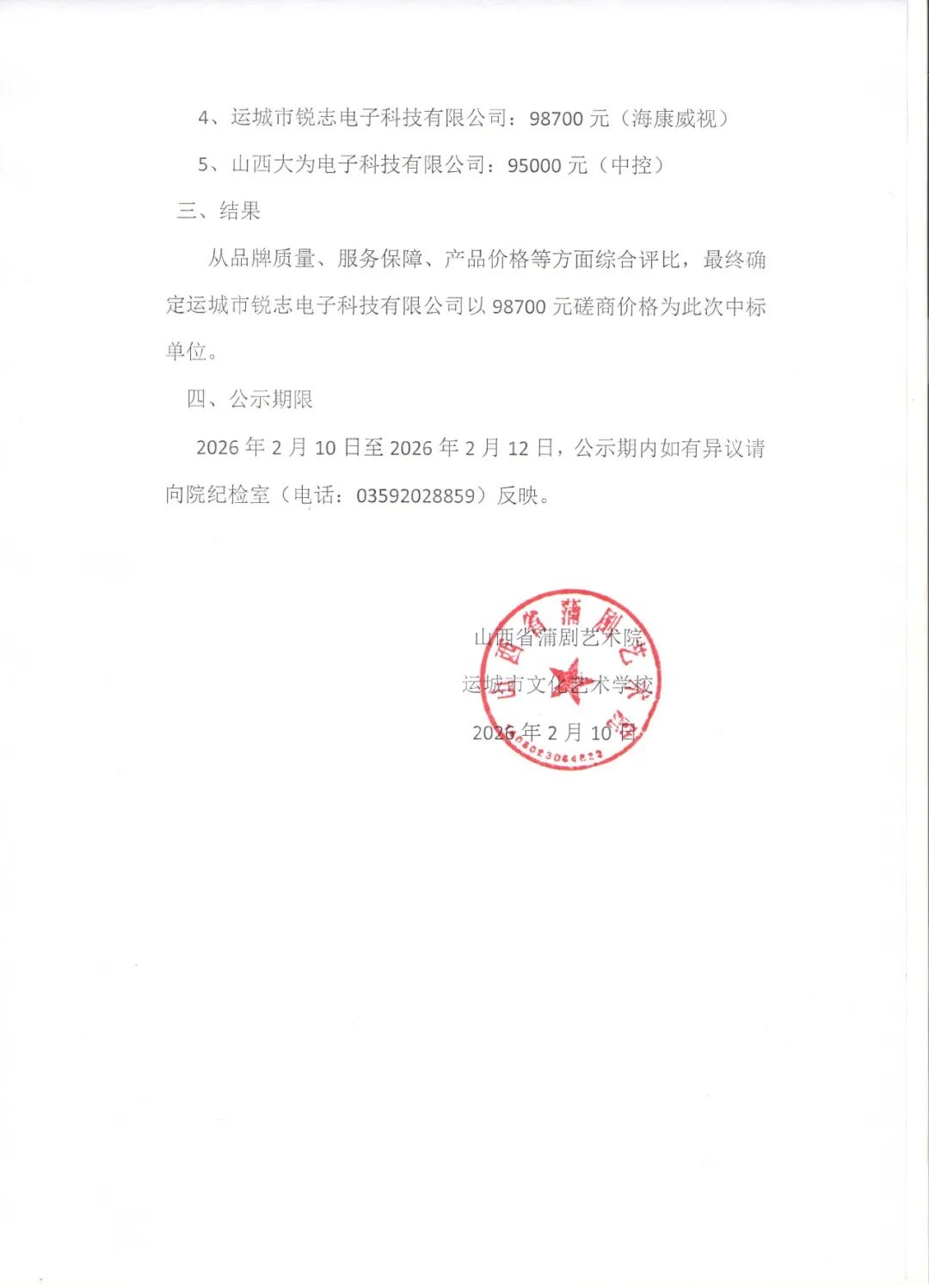 山西省蒲剧艺术院(运城市文化艺术学校)校园智能语音报警系统询比结果公示